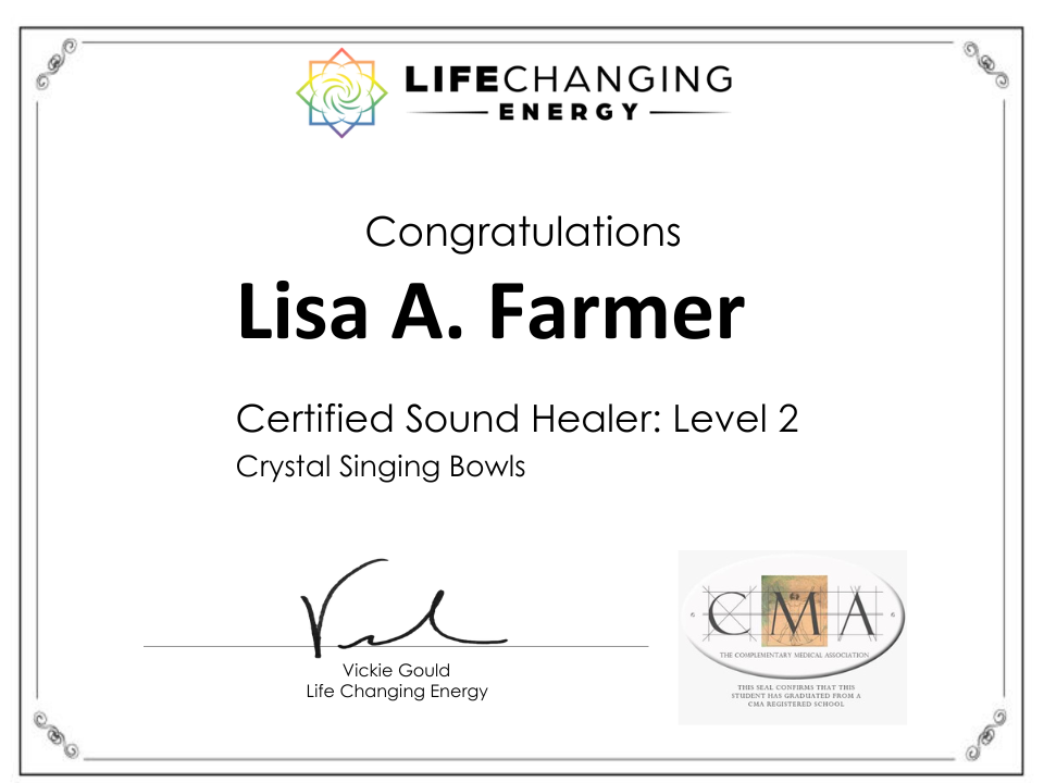 Lisa is a certified Sound Practitioner through Life Changing Energy and a Certified Reiki Master.